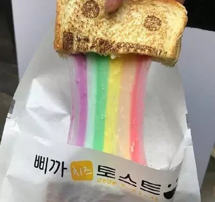 彩虹吐司口感独特、多层次、外皮香脆、内里柔软,据说里边是用芝士做成的,每个颜色是不同的水果口味的,一口下去有种说不出的惊喜,就是彩虹的那种美好。连面包都能吐出一道彩虹,现在的美食制作家真是了