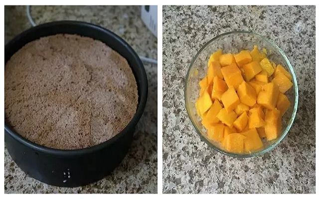 9、最后倒入芒果淋面糊,铺平,放入冰箱冷藏6小时以上即可享用了。