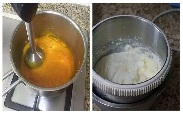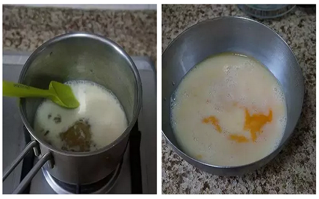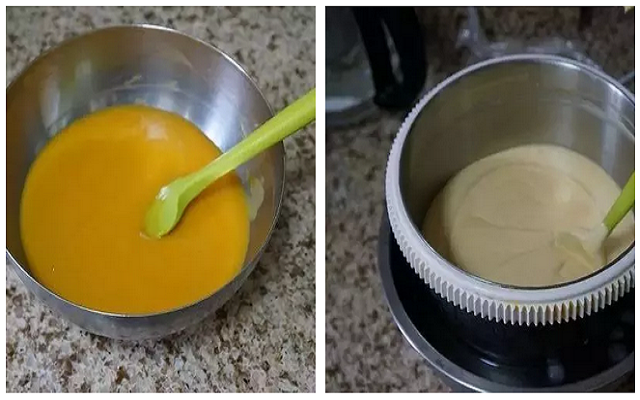 6、吉利丁片与牛奶混合加热,与芒果泥混合,混合后取出50g果泥与50ml水作为表