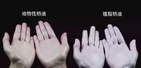 手搓法:取动物奶油、植物奶油分别涂于掌心,进行揉搓。结果动物奶油很快消失在掌心,手掌内只剩余少量油脂,像涂了护手霜。